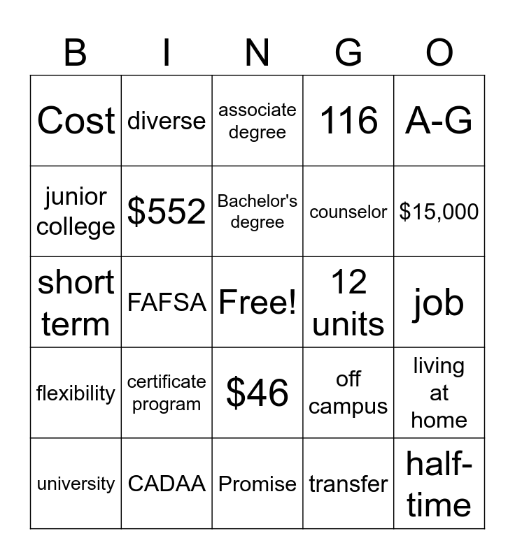 This bingo card has a free space and 24 words: certificate program, CADAA, Bachelor's degree, university, A-G, Cost, junior college, diverse, 12 units, $46, counselor, short term, off campus, living at home, $552, transfer, job, associate degree, $15,000, FAFSA, half-time, flexibility, 116 and Promise.