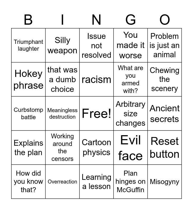 This bingo card has a free space and 43 words: Colour bleed, Misogyny, Racism, How did you know that?, Convoluted villain plot, Plan hinges on McGuffin, Issue not resolved, Problem is hero/bystander fault, Problem is just an animal, Overreaction, You made it worse, Arbitrary size changes, Cartoon physics, Working around the censors, Multipurpose levers/buttons!, Learning a lesson, Hero sadism, Curbstomp battle, Arbitrary stupidity, Chewing the scenery, Silly weapon, Weird Science, How did you understand that?, Triumphant laughter, Obvious political commentary, Ancient secrets, Animal mascot hijinks, Hidden villain/sudden betrayal, Evil face, Explains the plan, Universal experts, Reset button, Authorities are useless, Meaningless destruction, Damsel in distress, Hokey speech/dialogue, All your eggs in one McGuffin, racism, Hokey phrase, What are you armed with?, Animal as a weapon, that was a dumb choice and magic man bad.