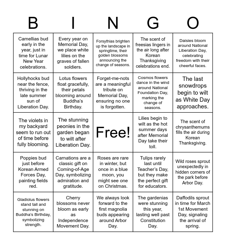 This bingo card has a free space and 30 words: Cherry blossoms never bloom as early as Independence Movement Day., Azaleas start to bud around Children’s Day, adding a splash of color to spring., The stunning peonies in the garden began to wilt after Liberation Day., Sunflowers stand tall and bloom beautifully in the heat of National Foundation Day., Camellias bud early in the year, just in time for Lunar New Year celebrations., Forsythias brighten up the landscape in springtime, their golden blossoms announcing the change of seasons., Lotus flowers float gracefully, their petals blooming around Buddha’s Birthday., Roses are rare in winter, but once in a blue moon, you might see one on Christmas., Lilies begin to wilt as the hot summer days after Memorial Day take their toll., We always look forward to the first magnolia buds appearing around Arbor Day., The scent of chrysanthemums fills the air during Korean Thanksgiving., Daffodils sprout in time for March 1st Movement Day, signaling the arrival of spring., The gardenias were stunning this year, lasting well past Constitution Day., Lavender fields in full bloom are a perfect sight on Parents’ Day., The last snowdrops begin to wilt as White Day approaches., Hibiscus flowers, also known as the national flower of Korea, stand proud on Independence Day., Tulips rarely last until Teacher’s Day, but they make the perfect gift for educators., Poppies bud just before Korean Armed Forces Day, painting fields red., Carnations are a classic gift on Coming-of-Age Day, symbolizing admiration and gratitude., Daisies bloom around National Liberation Day, celebrating freedom with their cheerful faces., The violets in my backyard seem to run out of time before fully blooming., Irises grow near the pond, their stunning colors reflecting beautifully on May 5th, Children’s Day., Every year on Memorial Day, we place white lilies on the graves of fallen soldiers., Cosmos flowers dance in the wind around National Foundation Day, marking the change of seasons., Hollyhocks bud near the fence, thriving in the late summer sun of Liberation Day., The scent of freesias lingers in the air long after Korean Thanksgiving celebrations end., Wild roses sprout unexpectedly in hidden corners of the park before Arbor Day., Gladiolus flowers stand tall and stunning on Buddha’s Birthday, symbolizing strength., Forget-me-nots are a meaningful tribute on Memorial Day, ensuring no one is forgotten. and Every Christmas, poinsettias are the perfect way to bring warmth and joy indoors..