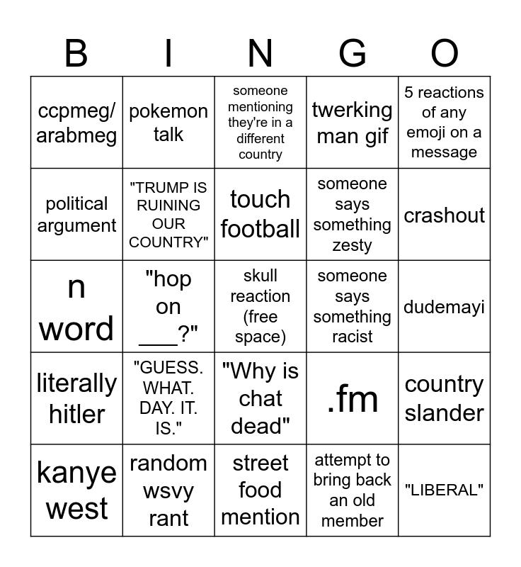 This bingo card has a free space and 24 words: "GUESS. WHAT. DAY. IT. IS.", random wsvy rant, touch football, kanye west, 5 reactions of any emoji on a message, ccpmeg/ arabmeg, political argument, pokemon talk, someone says something racist, "Why is chat dead", someone says something zesty, n word, .fm, country slander, "TRUMP IS RUINING OUR COUNTRY", attempt to bring back an old member, dudemayi, someone mentioning they're in a different country, crashout, "hop on ___?", "LIBERAL", literally hitler, twerking man gif and street food mention.
