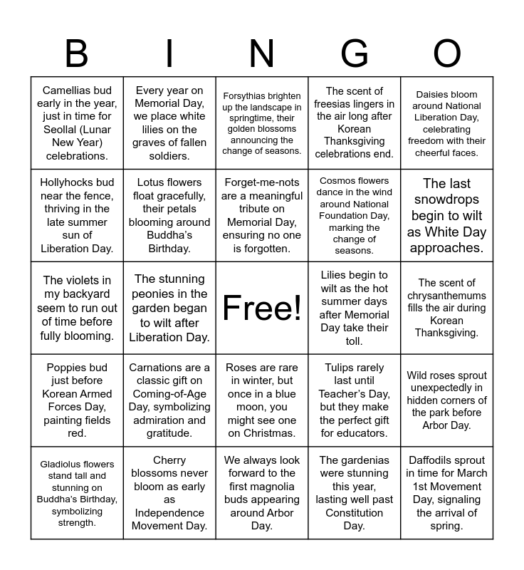 This bingo card has a free space and 30 words: Cherry blossoms never bloom as early as Independence Movement Day., Azaleas start to bud around Children’s Day, adding a splash of color to spring., The stunning peonies in the garden began to wilt after Liberation Day., Sunflowers stand tall and bloom beautifully in the heat of National Foundation Day., Camellias bud early in the year, just in time for Seollal (Lunar New Year) celebrations., Forsythias brighten up the landscape in springtime, their golden blossoms announcing the change of seasons., Lotus flowers float gracefully, their petals blooming around Buddha’s Birthday., Roses are rare in winter, but once in a blue moon, you might see one on Christmas., Lilies begin to wilt as the hot summer days after Memorial Day take their toll., We always look forward to the first magnolia buds appearing around Arbor Day., The scent of chrysanthemums fills the air during Korean Thanksgiving., Daffodils sprout in time for March 1st Movement Day, signaling the arrival of spring., The gardenias were stunning this year, lasting well past Constitution Day., Lavender fields in full bloom are a perfect sight on Parents’ Day., The last snowdrops begin to wilt as White Day approaches., Hibiscus flowers, also known as the national flower of Korea, stand proud on Independence Day., Tulips rarely last until Teacher’s Day, but they make the perfect gift for educators., Poppies bud just before Korean Armed Forces Day, painting fields red., Carnations are a classic gift on Coming-of-Age Day, symbolizing admiration and gratitude., Daisies bloom around National Liberation Day, celebrating freedom with their cheerful faces., The violets in my backyard seem to run out of time before fully blooming., Irises grow near the pond, their stunning colors reflecting beautifully on May 5th, Children’s Day., Every year on Memorial Day, we place white lilies on the graves of fallen soldiers., Cosmos flowers dance in the wind around National Foundation Day, marking the change of seasons., Hollyhocks bud near the fence, thriving in the late summer sun of Liberation Day., The scent of freesias lingers in the air long after Korean Thanksgiving celebrations end., Wild roses sprout unexpectedly in hidden corners of the park before Arbor Day., Gladiolus flowers stand tall and stunning on Buddha’s Birthday, symbolizing strength., Forget-me-nots are a meaningful tribute on Memorial Day, ensuring no one is forgotten. and Every Christmas, poinsettias are the perfect way to bring warmth and joy indoors..