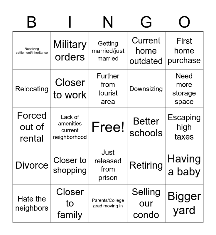 This bingo card has a free space and 28 words: Having a baby, Tired of renting, Downsizing, Selling our condo, Relocating, Getting married/just married, Military orders, Divorce, Better schools, Hate the neighbors, Forced out of rental, Current home outdated, Closer to family, Parents/College grad moving in, Need more storage space, Need a home office, Closer to shopping, Closer to work, Further from tourist area, Just released from prison, Receiving settlement/inheritance, Need home without stairs (currently in 2-story), Bigger yard, Lack of amenities current neighborhood, Escaping high taxes, Retiring, First home purchase and Just sold/selling investment property.