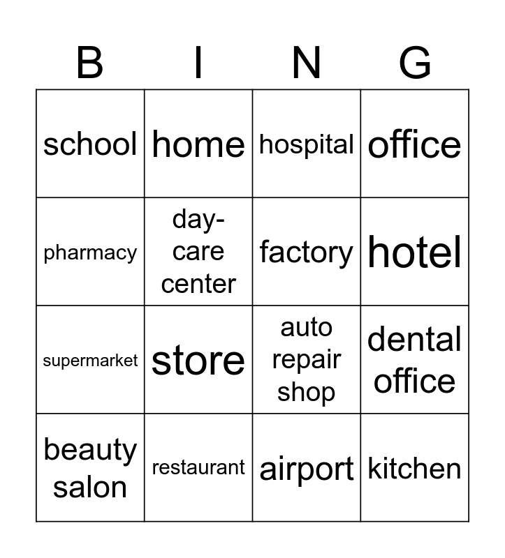 This bingo card has 16 words: restaurant, dental office, hospital, school, supermarket, home, auto repair shop, airport, pharmacy, day-care center, beauty salon, office, store, hotel, factory and kitchen.