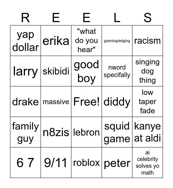 This bingo card has a free space and 24 words: n8zis, 9/11, good boy, 6 7, racism, yap dollar, larry, erika, diddy, lebron, nword specifally, drake, squid game, kanye at aldi, skibidi, peter, low taper fade, "what do you hear", singing dog thing, massive, ai celebrity solves yo math, family guy, gooning/edging and roblox.