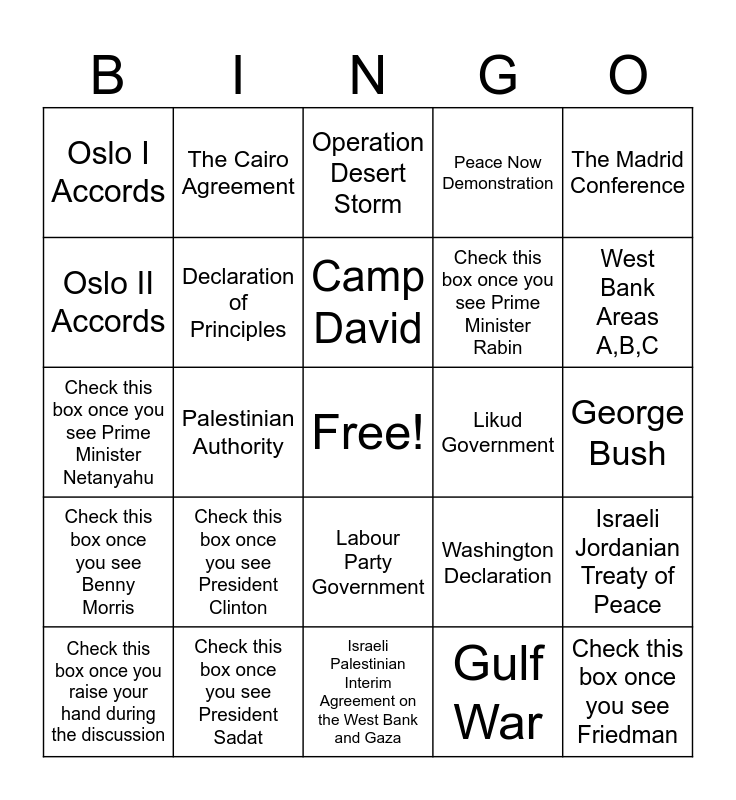 This bingo card has a free space and 24 words: Check this box once you see President Clinton, Check this box once you see President Sadat, Camp David, Check this box once you raise your hand during the discussion, The Madrid Conference, Oslo I Accords, Oslo II Accords, The Cairo Agreement, Likud Government, Labour Party Government, Check this box once you see Prime Minister Rabin, Check this box once you see Prime Minister Netanyahu, Washington Declaration, Israeli Jordanian Treaty of Peace, Declaration of Principles, Gulf War, George Bush, Operation Desert Storm, West Bank Areas A,B,C, Palestinian Authority, Check this box once you see Friedman, Check this box once you see Benny Morris, Peace Now Demonstration and Israeli Palestinian Interim Agreement on the West Bank and Gaza.