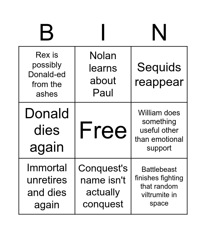 This bingo card has a free space and 8 words: William does something useful other than emotional support, Sequids reappear, Nolan learns about Paul, Immortal unretires and dies again, Rex is possibly Donald-ed from the ashes, Battlebeast finishes fighting that random viltrumite in space, Donald dies again and Conquest's name isn't actually conquest.