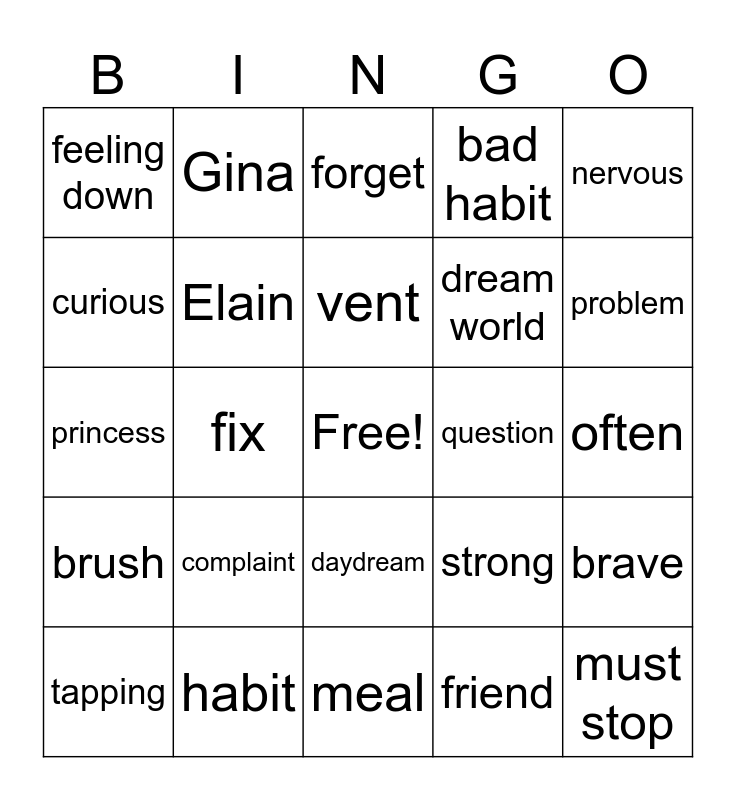 This bingo card has a free space and 24 words: complaint, habit, vent, tapping, nervous, feeling down, curious, Gina, question, daydream, dream world, princess, strong, brave, Elain, friend, often, forget, problem, fix, must stop, brush, bad habit and meal.