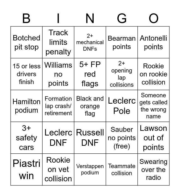 This bingo card has 25 words: Leclerc DNF, Verstappen podium, 5+ FP red flags, Piastri win, Antonelli points, Botched pit stop, 15 or less drivers finish, Track limits penalty, Leclerc Pole, Russell DNF, 2+ opening lap collisions, Hamilton podium, Sauber no points (free), Lawson out of points, Williams no points, Swearing over the radio, Someone gets called the wrong name, 2+ mechanical DNFs, Rookie on rookie collision, Formation lap crash/ retirement, Black and orange flag, Rookie on vet collision, 3+ safety cars, Bearman points and Teammate collision.