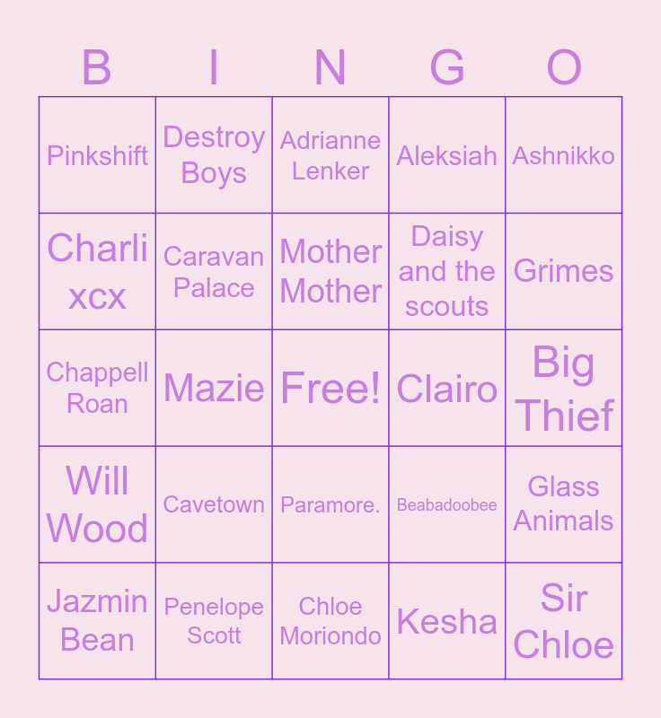 This bingo card has a free space and 24 words: Cavetown, Penelope Scott, Mother Mother, Jazmin Bean, Ashnikko, Pinkshift, Charli xcx, Destroy Boys, Clairo, Paramore., Daisy and the scouts, Chappell Roan, Beabadoobee, Glass Animals, Caravan Palace, Kesha, Big Thief, Adrianne Lenker, Grimes, Mazie, Sir Chloe, Will Wood, Aleksiah and Chloe Moriondo.