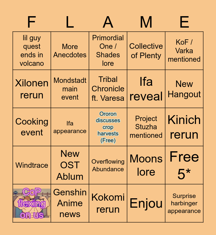 This bingo card has 3 images, a free space and 56 words: bouncy thing, CoP flexing on us, Interlude quest, lil guy quest ends in volcano, Kokomi rerun, Dain quest, Mondstadt main event, Dragonspine event, Ifa reveal, Volcano of Tollan, Collective of Plenty, New world boss, Official WUK face reveal, WUK fight, Mare Jivari mentioned, 7th tribe teased, KoF / Varka mentioned, Ifa appearance, Skirk appearance, Surprise harbinger appearance, Project Stuzha mentioned, Hexenzirkle / Witches mentioned, Moons lore, Primordial One / Shades lore, Nod Krai teaser, Tribal Chronicle ft. Varesa, Chef girl, Paimon Cries, New Hangout, SQ for an existing character, Chronicled Wish rerun, Venti rerun, Xiangyun rerun, Mualani rerun, Kinich rerun, Xilonen rerun, Cooking event, Lost Riches (Treasure Seelie), Windtrace, More Anecdotes, Overflowing Abundance, Venti rerun, New Artifact sets, New TCG cards, New Envisaged Echoes, New OST Ablum, Genshin Anime news, New collab announcement, Natlan teapot sets, Iansan walks to Celestia, Enjou, Xiuhcoatl/flamelord, Nod Krai lore, Free Iansan, Free 5* and Shooting Star game.