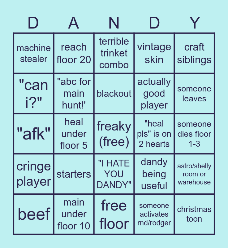 This bingo card has a free space and 24 words: starters, main under floor 10, blackout, beef, craft siblings, machine stealer, "can i?", reach floor 20, "heal pls" is on 2 hearts, "I HATE YOU DANDY", actually good player, "afk", dandy being useful, astro/shelly room or warehouse, "abc for main hunt!', someone activates rnd/rodger, someone dies floor 1-3, terrible trinket combo, someone leaves, heal under floor 5, christmas toon, cringe player, vintage skin and free floor.