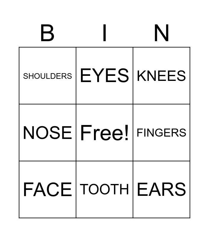 This bingo card has a free space and 14 words: HEAD, HAIR, FACE, EYES, NOSE, EARS, MOUTH, TEETH, TOOTH, SHOULDERS, HAND, FINGERS, KNEES and LEG.