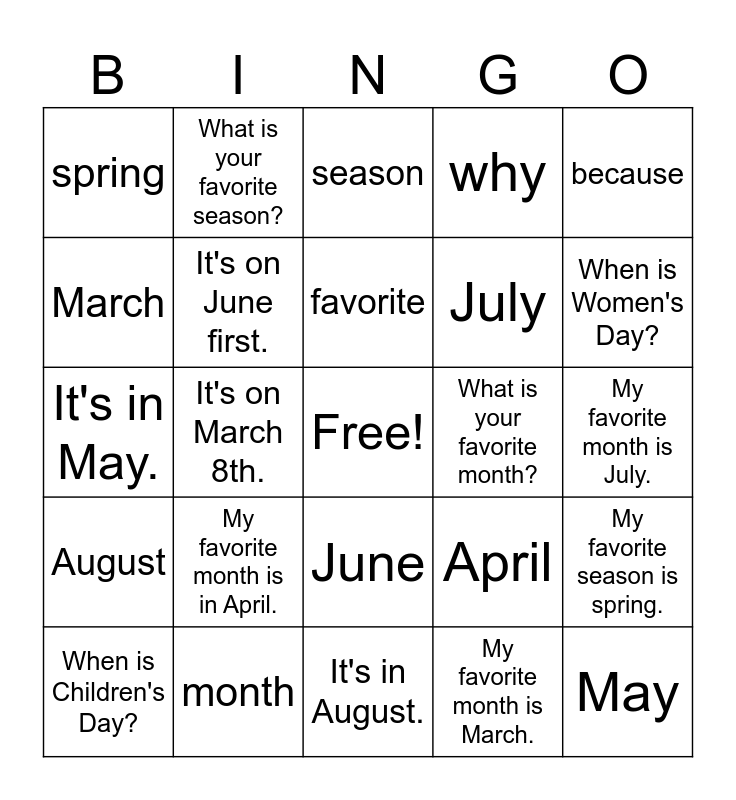 This bingo card has a free space and 24 words: My favorite month is in April., month, favorite, When is Children's Day?, because, spring, March, What is your favorite season?, What is your favorite month?, June, July, It's in May., April, My favorite season is spring., It's on June first., My favorite month is March., My favorite month is July., season, When is Women's Day?, It's on March 8th., May, August, why and It's in August..