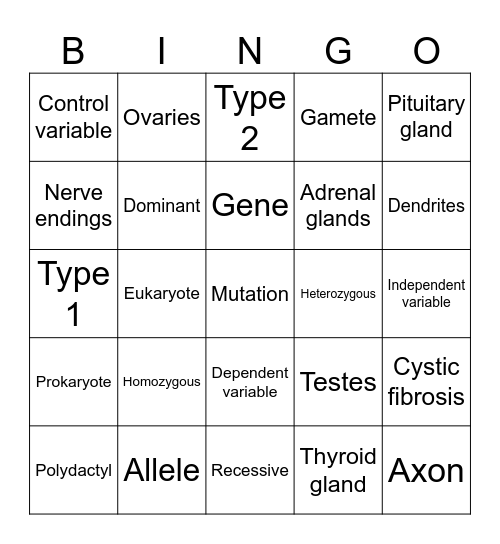 This bingo card has a free space and 24 words: Homozygous, Allele, Gene, Polydactyl, Pituitary gland, Control variable, Nerve endings, Ovaries, Heterozygous, Dependent variable, Adrenal glands, Type 1, Testes, Cystic fibrosis, Dominant, Thyroid gland, Independent variable, Type 2, Dendrites, Eukaryote, Axon, Prokaryote, Gamete and Recessive.