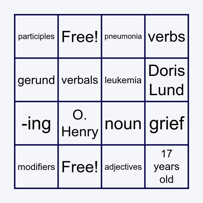 This bingo card has 24 words: Eric, Eric's mother, Doris Lund, infinitives, gerund, participles, verbals, Free!, Free!, "to", -ing, noun, loss, 22 years old, leukemia, courageous, adjectives, pneumonia, O. Henry, grief, modifiers, 17 years old, verbs and adverbs.