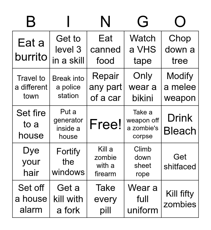 This bingo card has a free space and 24 words: Fortify the windows, Get a kill with a fork, Repair any part of a car, Set off a house alarm, Chop down a tree, Eat a burrito, Travel to a different town, Get to level 3 in a skill, Take a weapon off a zombie's corpse, Kill a zombie with a firearm, Only wear a bikini, Set fire to a house, Climb down sheet rope, Get shitfaced, Break into a police station, Wear a full uniform, Drink Bleach, Eat canned food, Modify a melee weapon, Put a generator inside a house, Kill fifty zombies, Dye your hair, Watch a VHS tape and Take every pill.