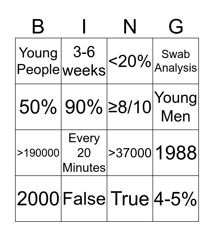 This bingo card has a free space and 15 words: 2000, 4-5%, <20%, Young People, Young Men, 50%, Every 20 Minutes, True, 90%, >190000, 1988, Swab Analysis, ≥8/10, 3-6 weeks and False.