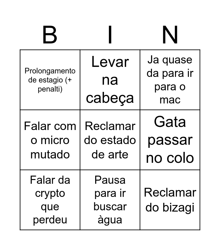 This bingo card has a free space and 8 words: Gata passar no colo, Ja quase da para ir para o mac, Levar na cabeça, Falar da crypto que perdeu, Prolongamento de estagio (+ penalti), Reclamar do bizagi, Falar com o micro mutado and Pausa para ir buscar àgua.
