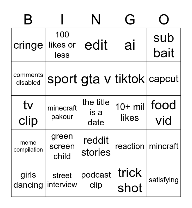 This bingo card has a free space and 24 words: green screen child, street interview, gta v, girls dancing, sub bait, cringe, comments disabled, 100 likes or less, 10+ mil likes, reddit stories, tiktok, tv clip, reaction, mincraft, sport, trick shot, food vid, edit, capcut, minecraft pakour, satisfying, meme compilation, ai and podcast clip.
