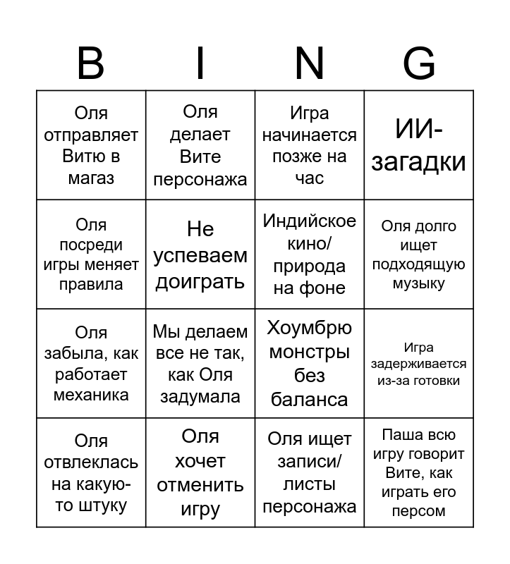 This bingo card has 16 words: Оля хочет отменить игру, Игра задерживается из-за готовки, Игра начинается позже на час, Оля отправляет Витю в магаз, Оля забыла, как работает механика, Оля делает Вите персонажа, Хоумбрю монстры без баланса, Оля ищет записи/листы персонажа, Оля посреди игры меняет правила, Не успеваем доиграть, Оля отвлеклась на какую-то штуку, ИИ-загадки, Мы делаем все не так, как Оля задумала, Оля долго ищет подходящую музыку, Индийское кино/природа на фоне and Паша всю игру говорит Вите, как играть его персом.