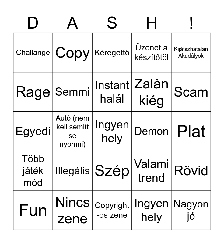 This bingo card has a free space and 29 words: Fun, Nehéz, Autó (nem kell semitt se nyomni), Elcseszett, Challange, Kéregettő, Semmi, Illegális, Demon, Nincs zene, Plat, Nagyon jó, Copyright -os zene, Ingyen hely, Scam, Gép igényes, Szép, Több játék mód, Kijátszhatalan Akadályok, Egyedi, Valami trend, Wave, Zalàn kiég, Rage, Üzenet a készítőtöl, Copy, Rövid, Instant halál and Levágás.