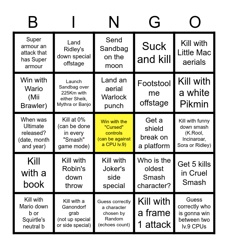 This bingo card has a free space and 24 words: Kill with Robin's down throw, Kill with a Ganondorf grab (not up special or side special), Land an aerial Warlock punch, Kill with Mario down b or Squirtle's neutral b, Kill with Little Mac aerials, Super armour an attack that has Super armour, Win with Wario (Mii Brawler), Land Ridley's down special offstage, Get a shield break on a platform, Kill with Joker's side special, Footstool me offstage, When was Ultimate released? (date, month and year), Who is the oldest Smash character?, Get 5 kills in Cruel Smash, Launch Sandbag over 225Km with either Sheik, Mythra or Banjo, Kill with a frame 1 attack, Kill with funny down smash (K.Rool, Incinaroar, Sora or Ridley), Send Sandbag on the moon, Kill with a white Pikmin, Kill at 0% (can be done in every "Smash" game mode), Guess correctly who is gonna win between two lv.9 CPUs, Kill with a book, Suck and kill and Guess correctly a character chosen by Random (echoes count).