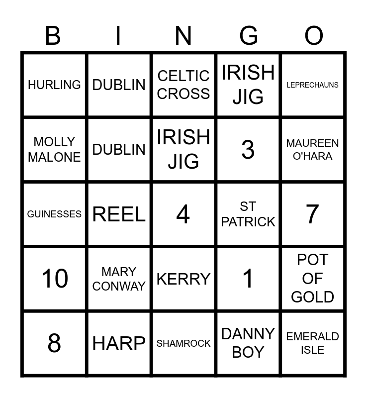 This bingo card has 25 words: MARY CONWAY, SHAMROCK, IRISH JIG, 8, LEPRECHAUNS, HURLING, MOLLY MALONE, DUBLIN, ST PATRICK, KERRY, 3, GUINESSES, 1, POT OF GOLD, DUBLIN, EMERALD ISLE, 7, CELTIC CROSS, MAUREEN O'HARA, REEL, 4, HARP, 10, IRISH JIG and DANNY BOY.