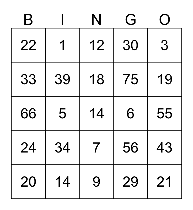 This bingo card has a free space and 24 words: 34, 14, 18, 20, 3, 22, 33, 1, 6, 7, 75, 66, 56, 43, 39, 29, 55, 12, 19, 5, 21, 24, 30 and 9.