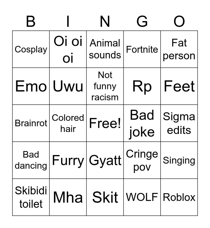 This bingo card has a free space and 24 words: Furry, Mha, Not funny racism, Skibidi toilet, Fat person, Cosplay, Emo, Oi oi oi, Bad joke, Gyatt, Rp, Brainrot, Cringe pov, Singing, Uwu, WOLF, Sigma edits, Animal sounds, Feet, Colored hair, Roblox, Bad dancing, Fortnite and Skit.