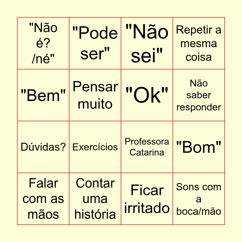 This bingo card has 24 words: Fazer a chamada, Certo?, Não saber responder, "Vamo lá", "Bem", "Não é? /né", Pensar muito, "Pode ser", Contar uma história, Alguém para ler, Dúvidas?, Professora Catarina, Tá?, Assobiar, "Ok", Pessoal, Ficar irritado, "Não sei", Exercícios, "Bom", Falar com as mãos, Sons com a boca/mão, Repetir a mesma coisa and Tossir.