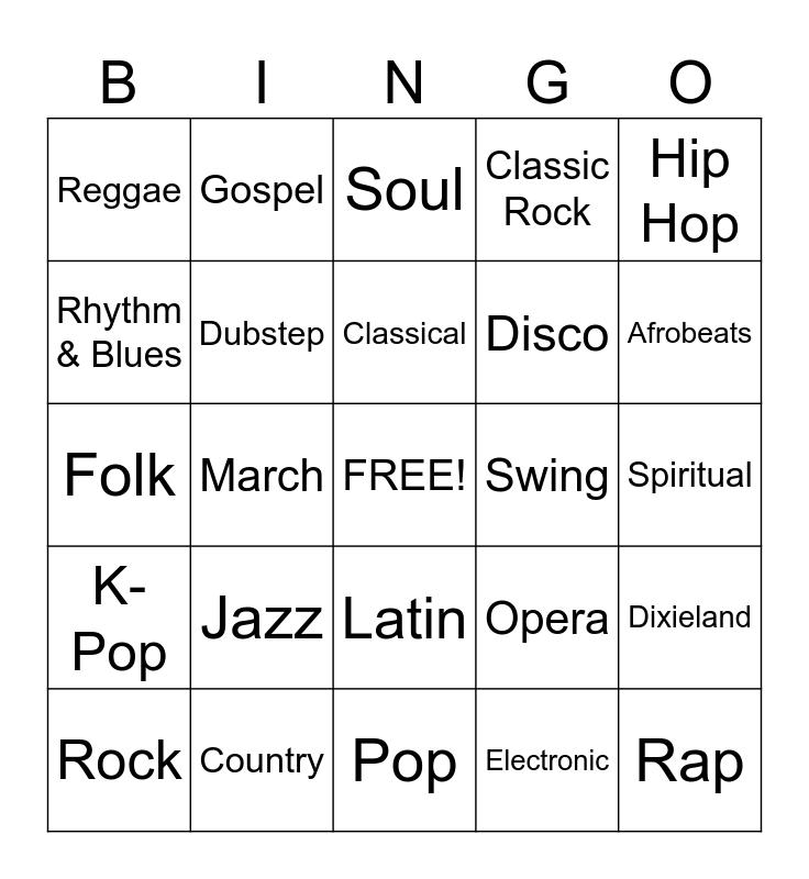 This bingo card has a free space and 24 words: Jazz, Country, Classical, Rock, Hip Hop, Reggae, Rhythm & Blues, Gospel, Swing, Latin, Disco, Folk, Opera, Dixieland, Dubstep, Electronic, Spiritual, Soul, Afrobeats, March, Rap, K-Pop, Classic Rock and Pop.