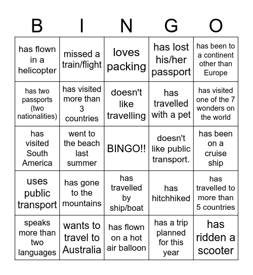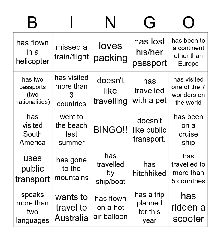 This bingo card has a free space and 24 words: has gone to the mountains, wants to travel to Australia, doesn't like travelling, speaks more than two languages, has been to a continent other than Europe, has flown in a helicopter, has two passports (two nationalities), missed a train/flight, doesn't like public transport., has travelled by ship/boat, has travelled with a pet, has visited South America, has hitchhiked, has travelled to more than 5 countries, has visited more than 3 countries, has a trip planned for this year, has been on a cruise ship, loves packing, has visited one of the 7 wonders on the world, went to the beach last summer, has ridden a scooter, uses public transport, has lost his/her passport and has flown on a hot air balloon.