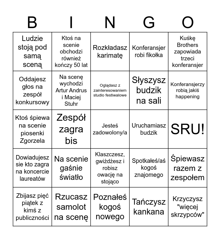 This bingo card has a free space and 24 words: Na scenie gaśnie światło, Rzucasz samolot na scenę, Oglądasz z zainteresowaniem studio festiwalowe, Zbijasz pięć piątek z kimś z publiczności, Kuśkę Brothers zapowiada trzeci konferansjer, Ludzie stoją pod samą sceną, Oddajesz głos na zespół konkursowy, Ktoś na scenie obchodzi również kończy 50 lat, Uruchamiasz budzik, Klaszczesz, gwiżdżesz i robisz owację na stojąco, Słyszysz budzik na sali, Ktoś śpiewa na scenie piosenki Zgorzela, Spotkałeś/aś kogoś znajomego, Śpiewasz razem z zespołem, Na scenę wychodzi Artur Andrus i Maciej Stuhr, Tańczysz kankana, SRU!, Rozkładasz karimatę, Konferansjerzy robią jakiś happening, Zespół zagra bis, Krzyczysz "więcej skrzypców", Dowiadujesz sie kto zagra na koncercie laureatów, Konferansjer robi fikołka and Poznałeś kogoś nowego.