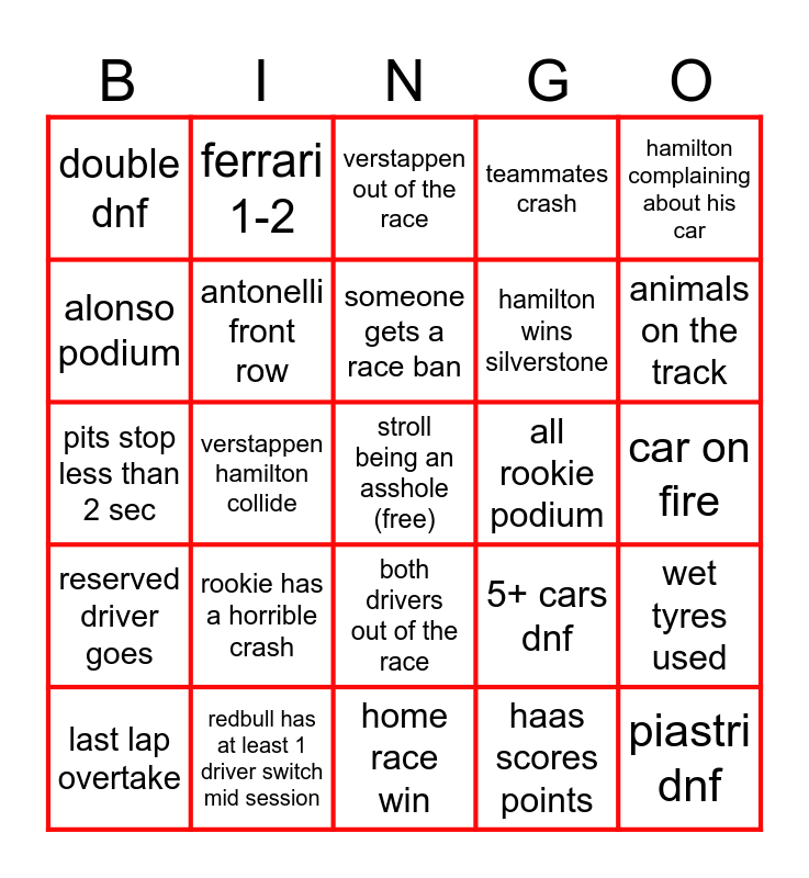 This bingo card has a free space and 24 words: rookie has a horrible crash, redbull has at least 1 driver switch mid session, someone gets a race ban, last lap overtake, hamilton complaining about his car, double dnf, alonso podium, ferrari 1-2, all rookie podium, both drivers out of the race, hamilton wins silverstone, pits stop less than 2 sec, 5+ cars dnf, wet tyres used, antonelli front row, haas scores points, car on fire, verstappen out of the race, animals on the track, verstappen hamilton collide, piastri dnf, reserved driver goes, teammates crash and home race win.