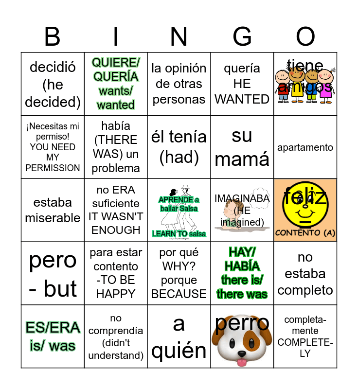 This bingo card has 10 images, a free space and 41 words: un día, estaba miserable, de su familia, había (THERE WAS) un problema, no comprendía (didn't understand), por qué WHY? porque BECAUSE, él tenía (had), simpática, tiene amigos, pero - but, no ERA suficiente IT WASN'T ENOUGH, quería HE WANTED, completa-mente COMPLETE-LY, feliz =, IMAGINABA (HE imagined), para estar contento -TO BE HAPPY, no comprendía -HE didn't UNDERSTAND, decidió (he decided), necesita escuchar, la opinión de otras personas, no estaba completo, en el apartamento, a quién, su mamá, papá, gato, perro, papa, apartamento, casa, computadora, QUIERE/ QUERÍA wants/ wanted, ES/ERA is/ was, ESTÁ /ESTABA is/was, HAY/ HABÍA there is/ there was, ¡Necesitas mi permiso! YOU NEED MY PERMISSION, TIENE/ TENÍA has/ had, Bob's! house LA CASA DE BOB!, le dijo SAID to him, pensaba que THOUGHT THAT and what he needs LO QUÉ NECESITA.
