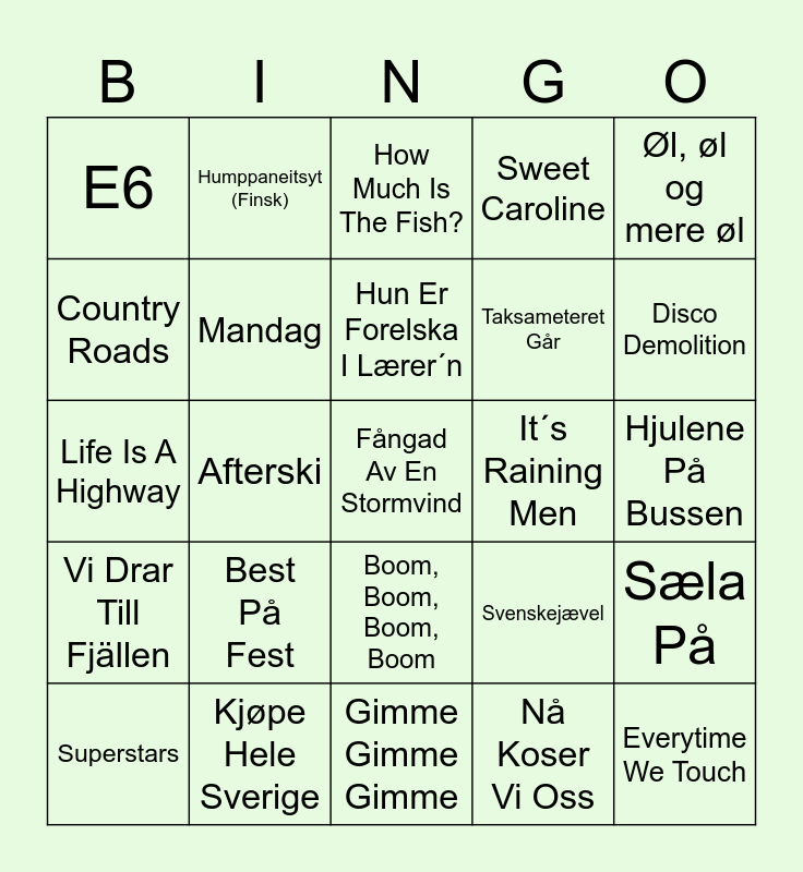 This bingo card has 40 words: Tore Tang, Life Is A Highway, Stikk Av Ditt Svin, Mandag, Kjøpe Hele Sverige, Boom, Boom, Boom, Boom, Hun Er Forelska I Lærer´n, Who Let The Dogs Out, Øl, øl og mere øl, Vi Drar Till Fjällen, Afterski, Sweet Caroline, Fångad Av En Stormvind, Hjulene På Bussen, It´s Raining Men, Best På Fest, Opp I Bakken, E6, Sjørøverne kommer!, How Much Is The Fish?, Sæla På, Nå Koser Vi Oss, Taksameteret Går, Country Roads, Ompa, Den Du Veit, Hør På Sangen Da, Glade Dager, Everytime We Touch, Typisk Norsk, Turné, Superstars, Pinne For Lander, Svenskejævel, Disco Demolition, Gimme Gimme Gimme, Hey Baby, Love Tonight, Humppaneitsyt (Finsk) and Når Du Slår Ut Håret Blir Jeg Slått Ut.