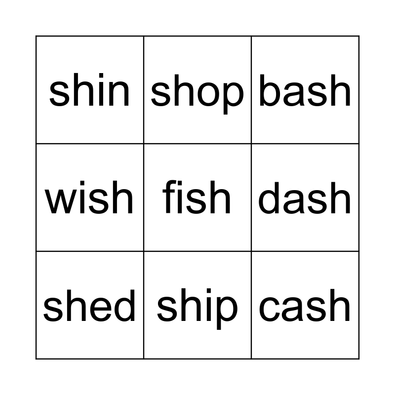 This bingo card has a free space and 14 words: dish, mash, shed, shop, wish, cash, shut, lash, ship, shin, shot, dash, bash and hush.