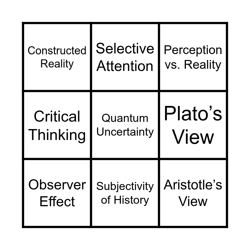 This bingo card has a free space and 8 words: Critical Thinking, Selective Attention, Plato’s View, Observer Effect, Perception vs. Reality, Constructed Reality, Subjectivity of History and Aristotle’s View.
