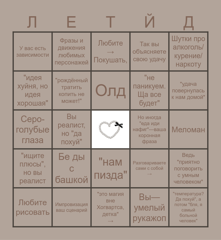 This bingo card has a free space and 24 words: Любите рисовать, Бе ды с башкой, Олд, Вы—умелый рукажоп, Шутки про алкоголь/курение/наркоту, У вас есть зависимости, Фразы и движения любимых персонажей, Любите → Покушать,, Но иногда "еда иди нафиг"—ваша коронная фраза, Меломан, Серо-голубые глаза, "рождённый тратить копить не может!", Разговариваете сами с собой →, Ведь "приятно поговорить с умным человеком", "идея хуйня, но идея хорошая", Импровизация ваш сценарий, "это магия вне Хогвартса, детка" →, Так вы объясняете свою удачу, "удача повернулась к нам домой", "ищите плюсы", но вы реалист, Вы реалист, но "да похуй", "нам пизда", "не паникуем. Ща все будет" and "температура? Да похуй", а потом "бля, я самый больной человек".