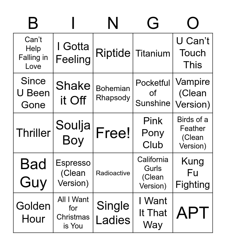 This bingo card has a free space and 40 words: Never Gonna Give You Up, Thriller, Sweet Caroline, Shake it Off, All I Want for Christmas is You, Radioactive, Bohemian Rhapsody, Party in the USA, U Can’t Touch This, Bad Guy, Soulja Boy, Titanium, APT, Birds of a Feather (Clean Version), Pink Pony Club, Espresso (Clean Version), Too Sweet, Can’t Help Falling in Love, Die with a Smile, Riptide, Kung Fu Fighting, I Want It That Way, Pocketful of Sunshine, Since U Been Gone, Stronger (What Doesn’t Kill You), Driver’s License (Clean Version), Somebody I Used to Know, Fiend (Chorus), Break Free (Clean Version), Anti-Hero, Flowers, Golden Hour, Made you Look, California Gurls (Clean Version), Vampire (Clean Version), Single Ladies, Poker Face (Clean Version), Halo, I Gotta Feeling and Hot to Go.