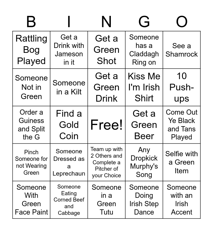 This bingo card has a free space and 24 words: Someone Dressed as a Leprechaun, Someone Eating Corned Beef and Cabbage, Get a Green Drink, Someone With Green Face Paint, See a Shamrock, Rattling Bog Played, Someone Not in Green, Get a Drink with Jameson in it, Get a Green Beer, Team up with 2 Others and Complete a Pitcher of your Choice, Kiss Me I'm Irish Shirt, Order a Guiness and Split the G, Any Dropkick Murphy's Song, Selfie with a Green Item, Someone in a Kilt, Someone Doing Irish Step Dance, Come Out Ye Black and Tans Played, Get a Green Shot, 10 Push-ups, Find a Gold Coin, Someone with an Irish Accent, Pinch Someone for not Wearing Green, Someone has a Claddagh Ring on and Someone in a Green Tutu.
