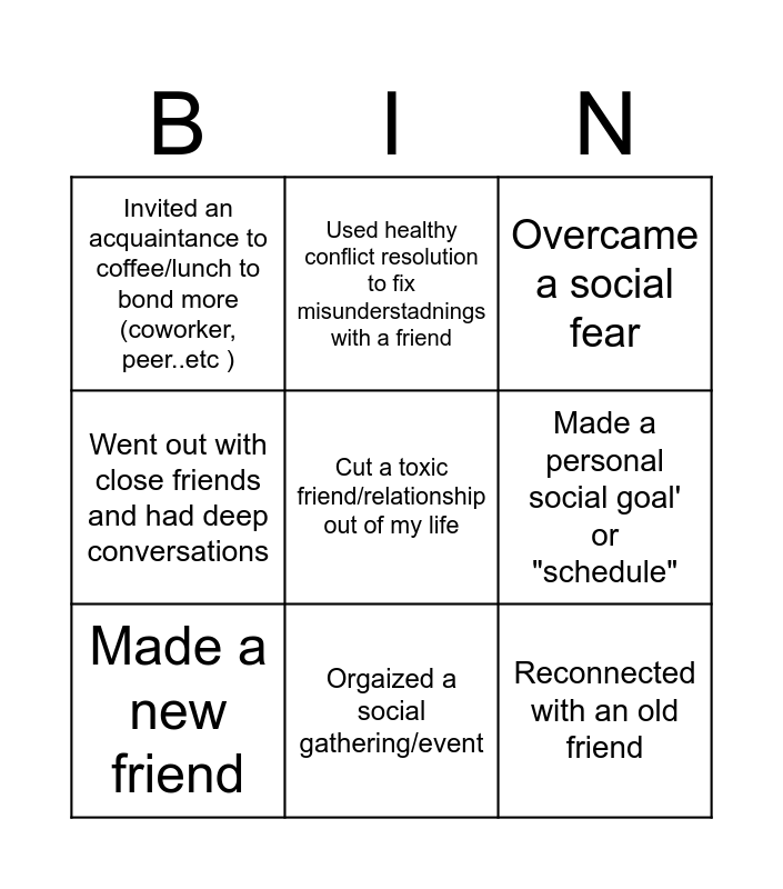This bingo card has 9 words: Made a new friend, Overcame a social fear, Used healthy conflict resolution to fix misunderstadnings with a friend, Went out with close friends and had deep conversations, Invited an acquaintance to coffee/lunch to bond more (coworker, peer..etc ), Made a personal social goal' or "schedule", Cut a toxic friend/relationship out of my life, Reconnected with an old friend and Orgaized a social gathering/event.