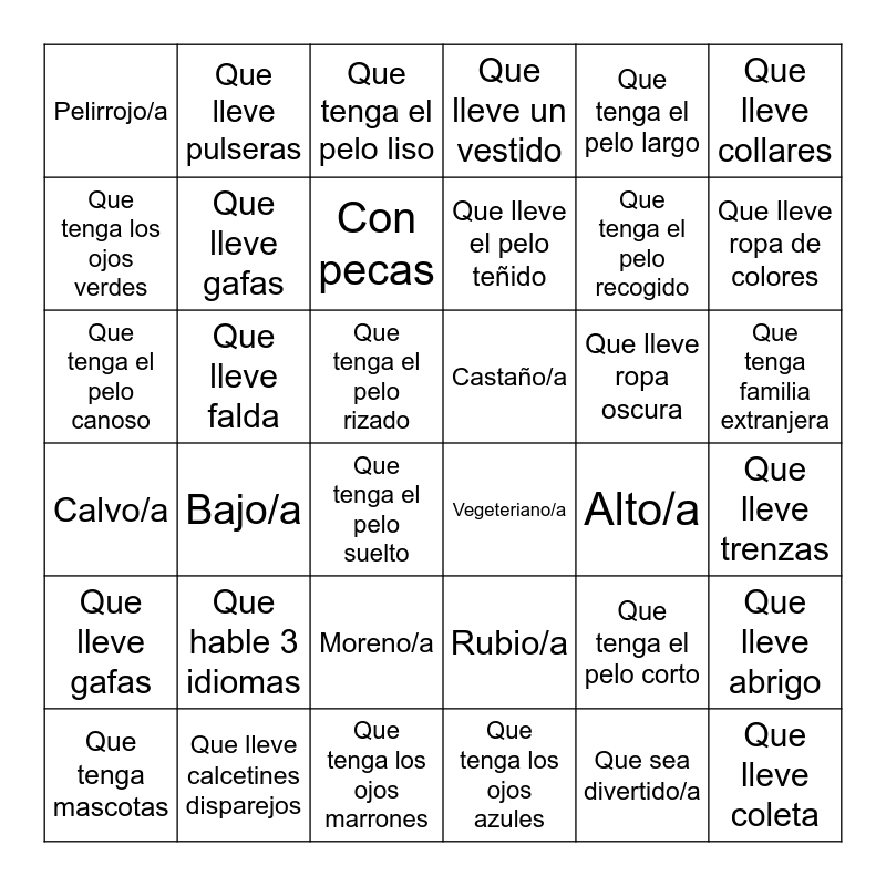 This bingo card has 36 words: Rubio/a, Moreno/a, Que tenga los ojos azules, Que tenga los ojos verdes, Calvo/a, Castaño/a, Que lleve gafas, Que tenga los ojos marrones, Que tenga el pelo largo, Que tenga el pelo corto, Que lleve ropa de colores, Que lleve un vestido, Que lleve abrigo, Que lleve falda, Que lleve el pelo teñido, Pelirrojo/a, Que lleve gafas, Que lleve ropa oscura, Que tenga el pelo canoso, Que tenga el pelo liso, Que tenga el pelo rizado, Bajo/a, Vegeteriano/a, Que tenga el pelo suelto, Alto/a, Que lleve pulseras, Que tenga el pelo recogido, Que lleve calcetines disparejos, Con pecas, Que lleve collares, Que lleve coleta, Que tenga mascotas, Que lleve trenzas, Que tenga familia extranjera, Que hable 3 idiomas and Que sea divertido/a.