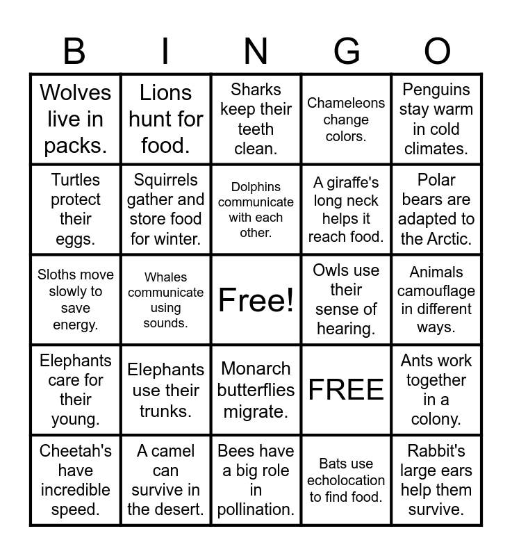 This bingo card has a free space and 25 words: Elephants use their trunks., Bees have a big role in pollination., Dolphins communicate with each other., Cheetah's have incredible speed., Penguins stay warm in cold climates., Wolves live in packs., Turtles protect their eggs., Lions hunt for food., Owls use their sense of hearing., Monarch butterflies migrate., A giraffe's long neck helps it reach food., Sloths move slowly to save energy., FREE, Ants work together in a colony., Squirrels gather and store food for winter., Bees make honey., Animals camouflage in different ways., Sharks keep their teeth clean., Polar bears are adapted to the Arctic., Whales communicate using sounds., Rabbit's large ears help them survive., A camel can survive in the desert., Elephants care for their young., Chameleons change colors. and Bats use echolocation to find food..