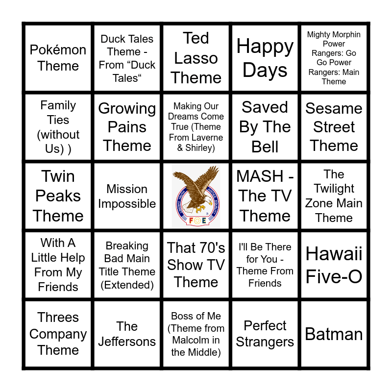 This bingo card has a free space and 50 words: Angela (Theme from Taxi), Batman, Big Bang Theory Theme, Boss of Me (Theme from Malcolm in the Middle), Breaking Bad Main Title Theme (Extended), Dallas, Duck Tales Theme - From “Duck Tales“, Everywhere You Look (Full House Theme), Family Ties (without Us) ), Gilligan's Island Theme, Growing Pains Theme, Happy Days, Hawaii Five-O, I'll Be There for You - Theme From Friends, Knight Rider, Main Title, Making Our Dreams Come True (Theme From Laverne & Shirley), MASH - The TV Theme, Miami Vice Theme, Mighty Morphin Power Rangers: Go Go Power Rangers: Main Theme, Mission Impossible, Perfect Strangers, Pokémon Theme, Saved By The Bell, Scooby-Doo, Scrubs, Sesame Street Theme, Stranger Things, Ted Lasso Theme, That 70's Show TV Theme, The A-Team, The Fishin' Hole, The Fresh Prince of Bel-Air, The Golden Girls - The Main Title Theme, The Jeffersons, The Mandalorian, The Muppet Show - The Main Title Theme, The Office Theme, The Sopranos - Woke Up This Morning - Main Theme, The Twilight Zone Main Theme, The X-Files Theme (Main Title: Materia Primoris), Theme from Beverly Hills, 90210, Theme From The Brady Bunch, Theme from The Dukes of Hazzard (Good Ol' Boys), Threes Company Theme, Twin Peaks Theme, Welcome Back (Theme from Welcome Back, Kotter), Where Everybody Knows Your Name (Cheers Theme), With A Little Help From My Friends and Wonder Woman.