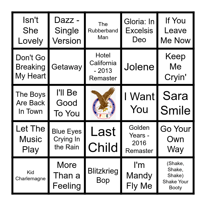 This bingo card has a free space and 49 words: (Don't Fear) The Reaper, (Shake, Shake, Shake) Shake Your Booty, 50 Ways to Leave Your Lover, Blitzkrieg Bop, Blue Eyes Crying In the Rain, Boogie Fever, Dazz - Single Version, Disco Inferno, Don't Go Breaking My Heart, Get Up and Boogie - That's Right, Getaway, Gloria: In Excelsis Deo, Go Your Own Way, Golden Years - 2016 Remaster, Good Hearted Woman, Heaven Must Be Missing An Angel, Hotel California - 2013 Remaster, I Want You, I'd Really Love to See You Tonight, If You Leave Me Now, I'll Be Good To You, I'm Mandy Fly Me, Isn't She Lovely, Jolene, Just To Be Close To You, Keep Me Cryin', Kid Charlemagne, Kiss and Say Goodbye, Last Child, Let The Music Play, Livin' Thing, Lonely Night (Angel Face), Love Hangover, Love Is The Drug, More Than a Feeling, One of These Days, Play That Funky Music, Rock'n Me, Sara Smile, Say Goodbye to Hollywood, Somebody To Love - Remastered, Something He Can Feel, Summer, That'll Be the Day, The Boys Are Back In Town, The Rubberband Man, X-Offender, You Should Be Dancing and You'll Never Find Another Love Like Mine.