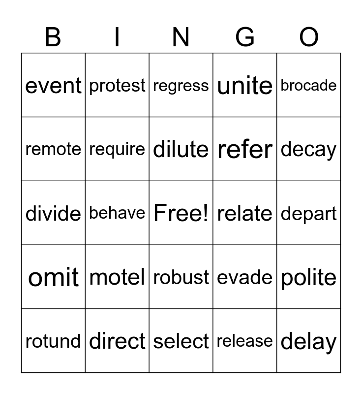 This bingo card has a free space and 31 words: select, equip, behave, elect, event, regress, require, evade, relate, release, depart, delay, eject, belong, decay, hotel, polite, motel, omit, robust, brocade, protect, rotund, protest, refer, remote, unite, divide, direct, dilute and divert.