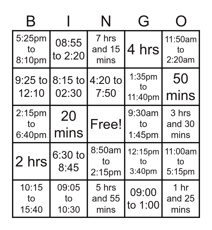 This bingo card has a free space and 24 words: 6:30 to 8:45, 09:05 to 10:30, 4:20 to 7:50, 10:15 to 15:40, 11:50am to 2:20am, 5:25pm to 8:10pm, 9:25 to 12:10, 08:55 to 2:20, 9:30am to 1:45pm, 8:50am to 2:15pm, 1:35pm to 11:40pm, 2:15pm to 6:40pm, 12:15pm to 3:40pm, 11:00am to 5:15pm, 8:15 to 02:30, 09:00 to 1:00, 3 hrs and 30 mins, 7 hrs and 15 mins, 50 mins, 20 mins, 1 hr and 25 mins, 2 hrs, 4 hrs and 5 hrs and 55 mins.