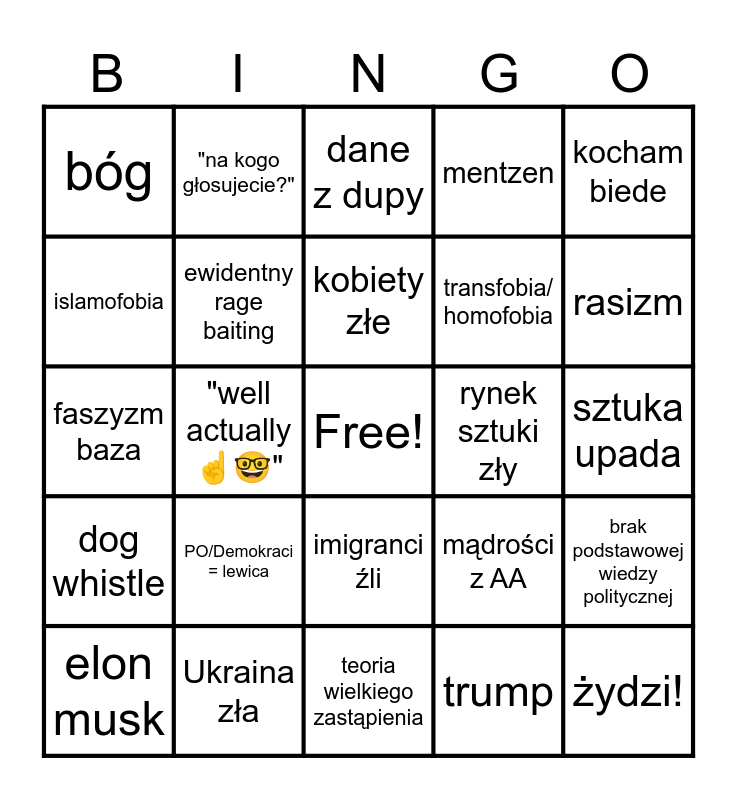 This bingo card has a free space and 27 words: mądrości z AA, piekło mężczyzn, transfobia/ homofobia, teoria wielkiego zastąpienia, islamofobia, dane z dupy, "na kogo głosujecie?", dog whistle, rynek sztuki zły, brak podstawowej wiedzy politycznej, faszyzm baza, mentzen, elon musk, Ukraina zła, rasizm, brak podstawowej wiedzy politycznej, ewidentny rage baiting, kobiety złe, PO/Demokraci = lewica, bóg, sztuka upada, trump, "well actually ☝️🤓", żydzi!, imigranci źli, kocham biede and katyń/wołyń/lwów.