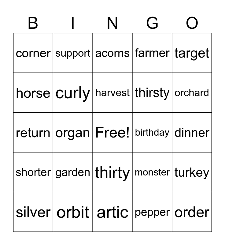 This bingo card has a free space and 24 words: garden, orbit, harvest, silver, target, corner, horse, support, birthday, thirty, thirsty, return, monster, turkey, curly, pepper, dinner, acorns, orchard, organ, order, shorter, farmer and artic.